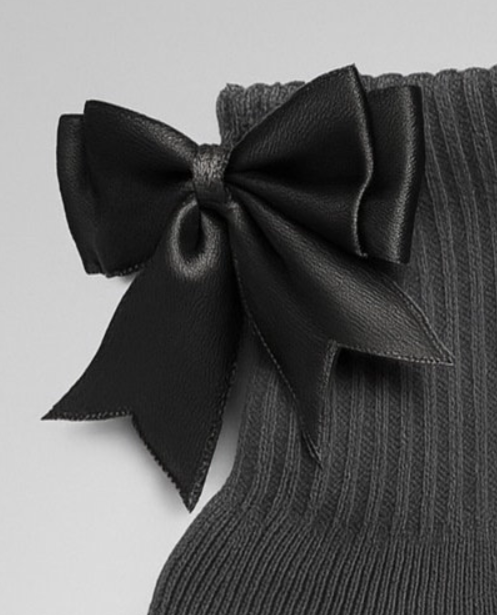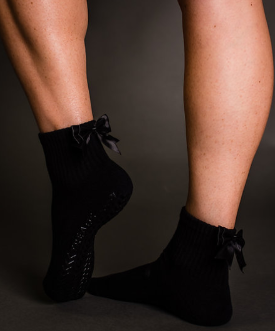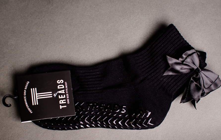 This one size fits most all black quarter grip sock is a bold statement. We have added a unique design of a double satin bow which adds structure to this performance sock. Playful, chic, and feminine. Finished with strong TREADS grips in color black.
