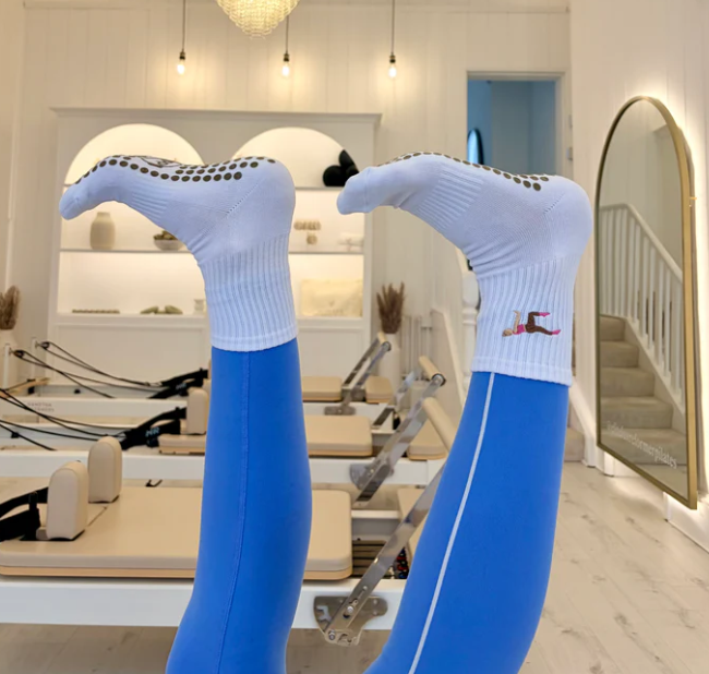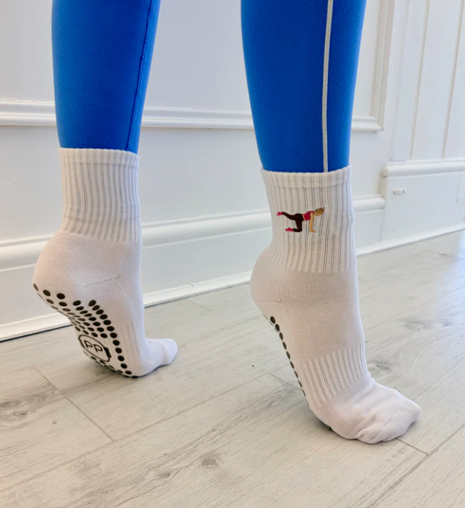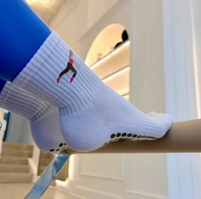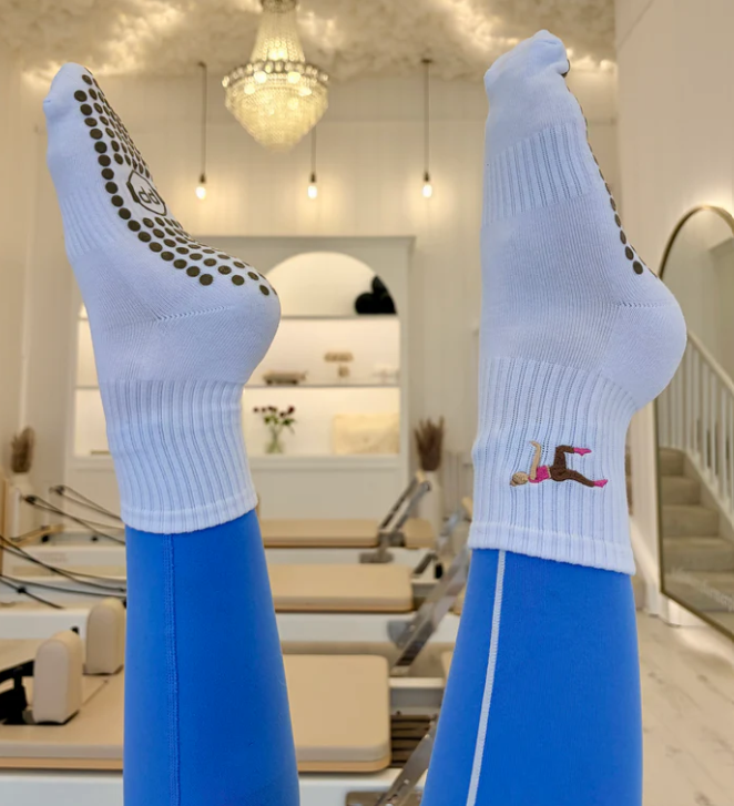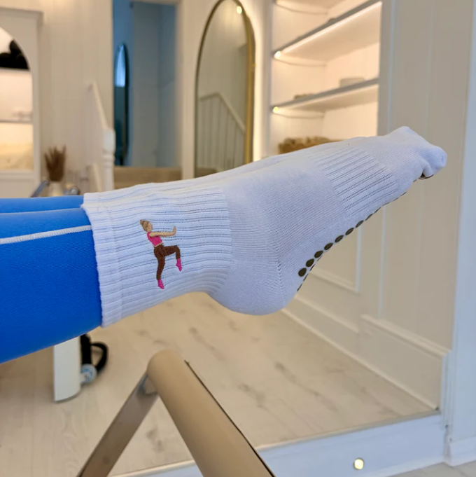 The Pilates Girl Grip Sock features a clean white ribbed crew silhouette with an embroidered blonde figure mid-exercise, bringing actual Pilates movement into the design instead of just posing. It feels more real, more active—like it was made by someone who’s actually been on a reformer before.