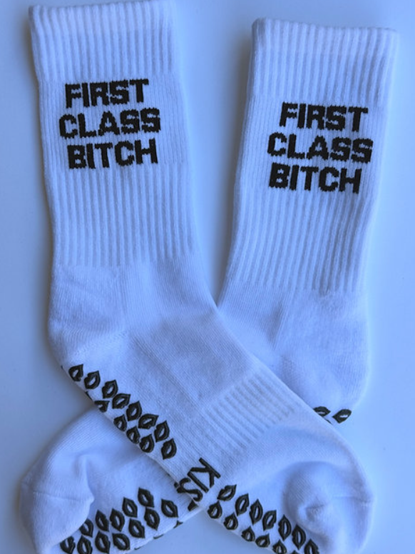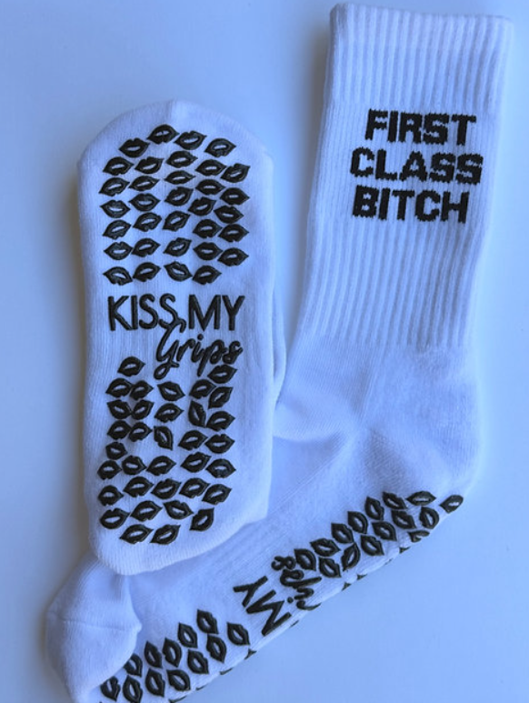 Board early, own every move. These First Class Bitch crew grip socks from Kiss My Grips blend statement style with studio-grade tech. The breathable knit and secure ribbed cuff hug your foot without slipping, while the full-coverage kiss-print grips deliver non-slip traction through planks, pikes, and pulses. Streamlined toes, cushy underfoot feel, and a clean white crew profile make them as wearable with sneakers as they are on the reformer. Perfect for Pilates, barre, and yoga—or gifting the friend who always gets an upgrade. Attitude on the cuff, confidence in every rep.