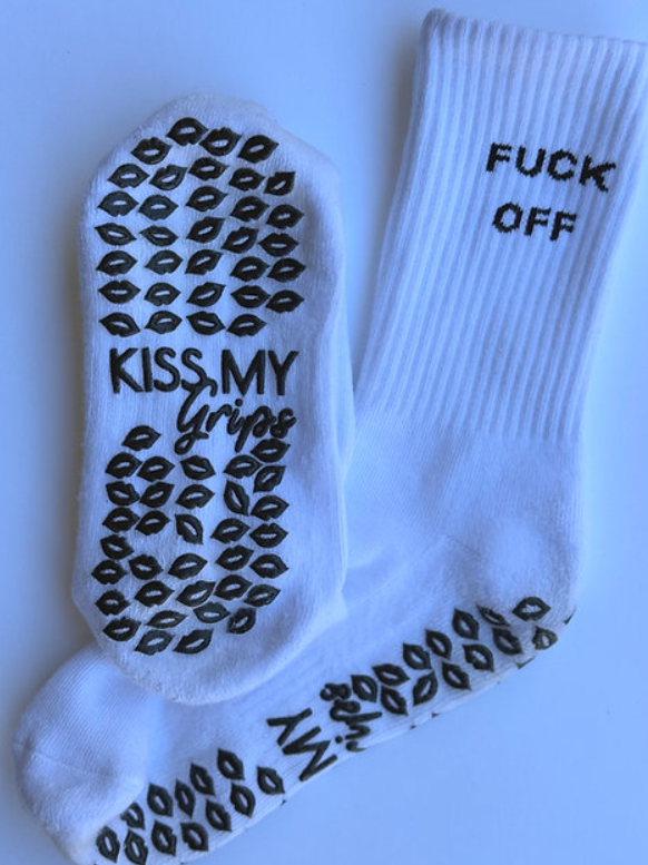 Strong stance, stronger grip. Our FUCK OFF crew grip socks from Kiss My Grips bring unapologetic energy to class with a crisp white profile and statement cuff. Beneath the sass is serious function: a breathable knit that hugs the foot, a secure ribbed cuff that stays put, and full-coverage kiss-print grips that deliver non-slip traction through planks, pikes, and pulses. Streamlined toes and cushy underfoot comfort keep you moving, while the cheeky sole graphic brings a wink to every workout. Wear them for Pilates, barre, yoga—or anytime you want your boundaries and your balance dialed in.
