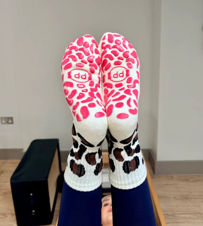 Leopard print crew grip sock with bold pink grip sole, breathable cotton blend, and arch support—made for Pilates, Lagree, barre, and statement studio style.