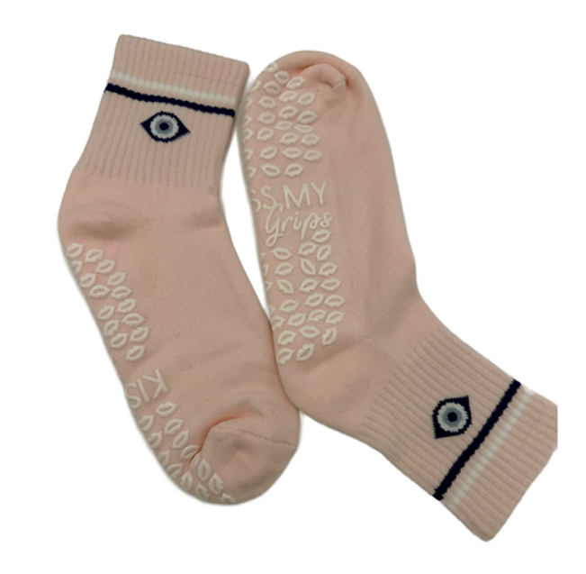 Balance your flow with a pop of blush. These Pink Evil Eye crew grip socks from Kiss My Grips deliver studio-grade stability in a soft, breathable knit, finished with a navy stripe and the iconic eye for a little talisman energy. Beneath the style: full-coverage grips for no-slip confidence on reformers, mats, and studio floors, plus a secure ribbed cuff and smooth, streamlined toe for comfort in every move. Wear them for Pilates, barre, and yoga—or anytime you want clean lines, subtle color, and dependable traction. Sweet shade, serious performance.