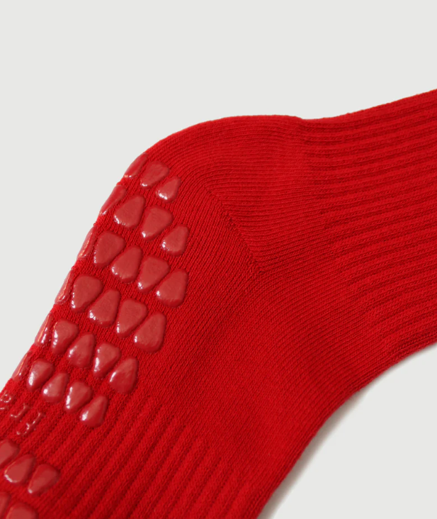 Red is the color of the season and the perfect accent to any outfit. This soft, breathable studio staple features compression arch support and our proprietary non-slip grip design that's made to stick. The organic cotton blend incorporates silver ions, which provide natural antimicrobial properties that help reduce odors and bacterial growth. It's also been combed with brushes to remove the shorter, weaker fibers, leaving it softer and more durable than traditional cotton. Each pair features a label detail on the outer ankle. They're the perfect length - not too short and not too long - hitting in between a standard crew and ankle sock. Fits US women's size 5-10.