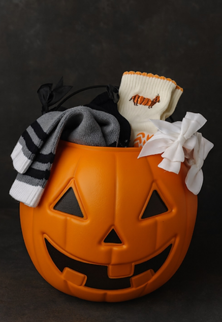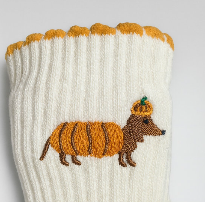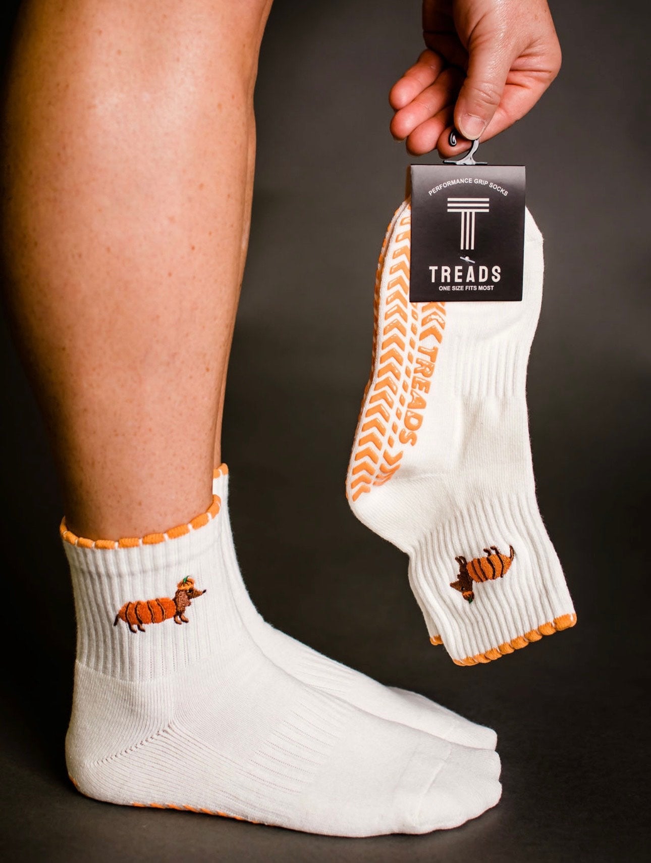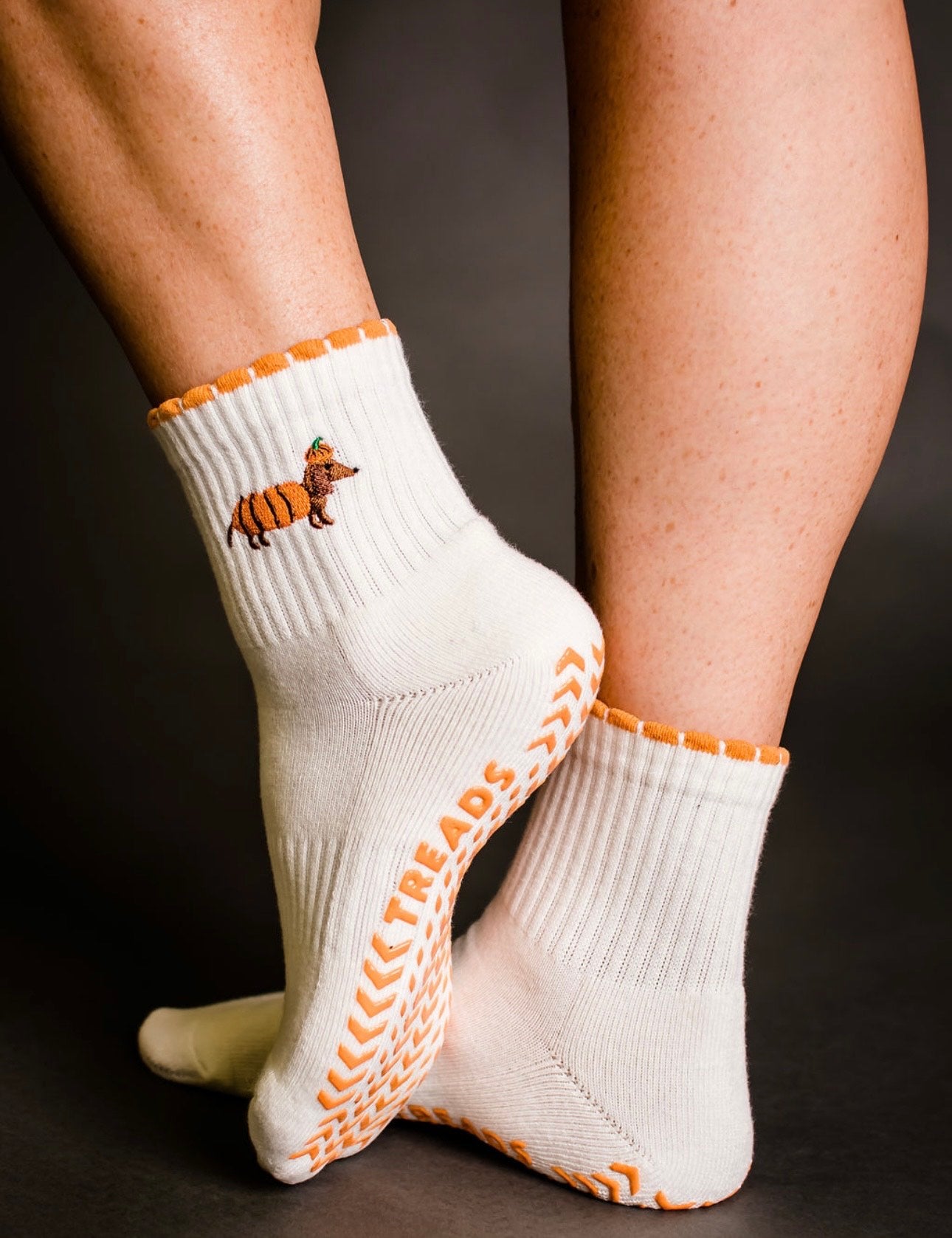 This one size fits most creamy grip sock has an embroidered dachshund who wins the costume contest as a pupkin. Cuffed with a orange bubble ruffle and matching TREADS grips.