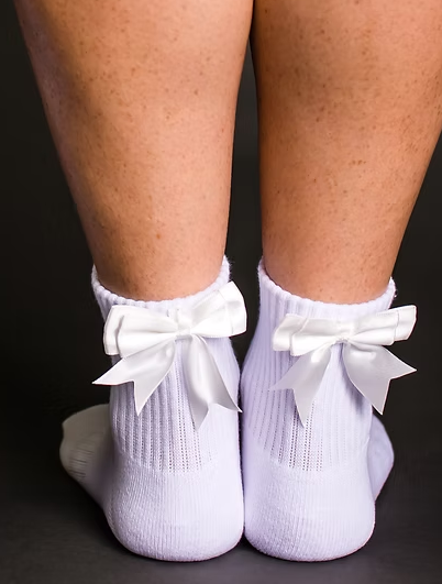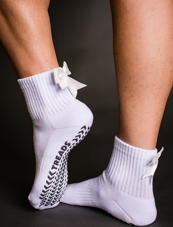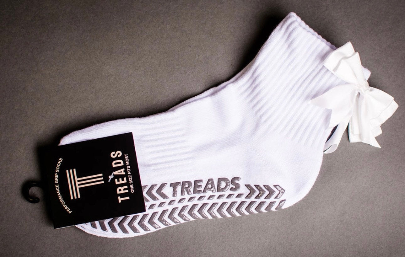 This one size fits most all white grip sock is Pure Grace. She's elegant, graceful, and the double satin bow adds a touch of girly. Finished with strong TREADS grips in color grey.