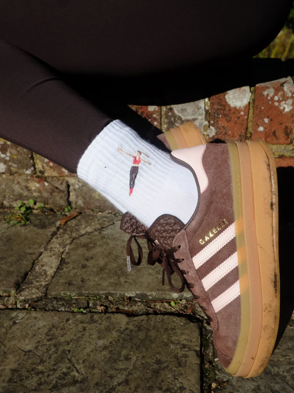 The Side Plank Girl Grip Sock features a clean white ribbed crew silhouette with an embroidered blonde figure mid–side plank, capturing that exact moment of strength, balance, and quiet suffering everyone in class pretends is fine.