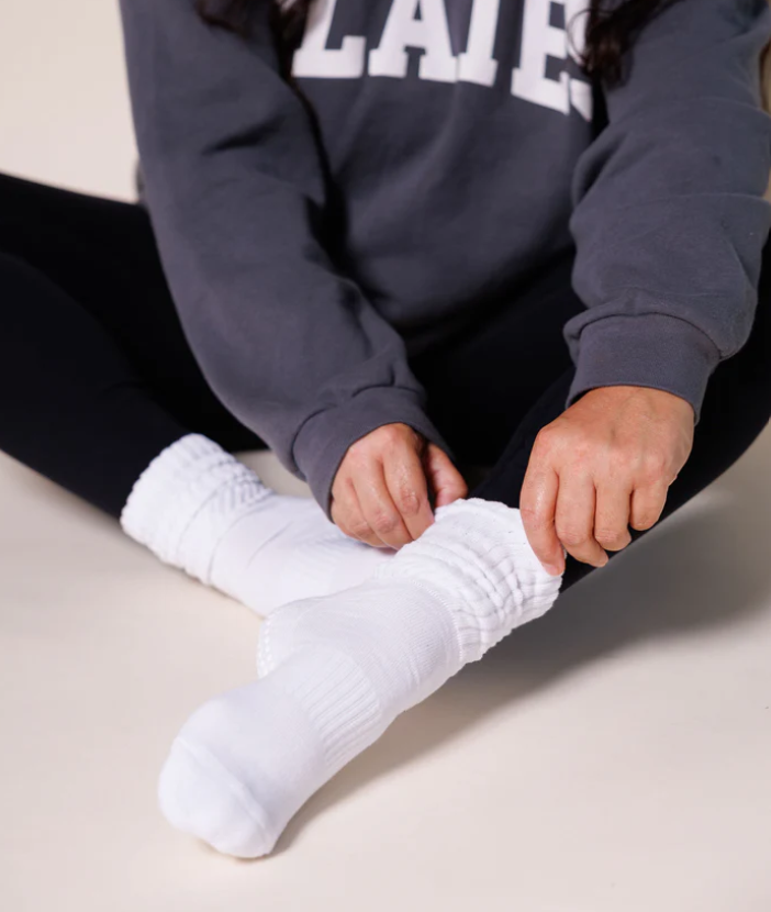 Elevate your workout with our White Scrunch Grip Socks – the perfect blend of style and performance. These non-slip grip socks feature a relaxed scrunch fit that adds effortless style to your Pilates, barre, or yoga practice.